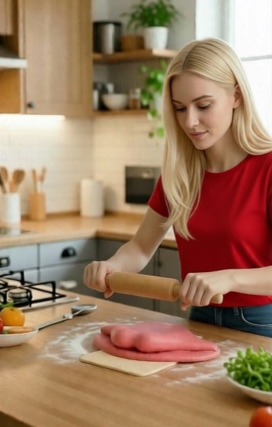 Нейросеть поняла буквально мой запрос и показала изображение девушки на кухне, которая скалкой закатывает большие, пухлые губёшки🤭