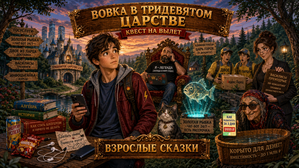 В некотором царстве, в некотором государстве под названием спальный район обычного города жил-был школьник. Район как район, десять минут от метро, если бежать, и двадцать — если листать TikTok на ходу. Если не смотреть под ноги, то можно упасть в открытый люк, который почему-то никто не закрывал уже полгода, потому что в местном ЖЭХе работает только один сантехник, и тот в отпуске». Звали школьника Вовка. Не Вовка-морковка, не Вован-баклан, а просто Вовка — девятиклассник с телефоном, из которого торчали не только наушники, но и зарядка, и пауэрбанк.