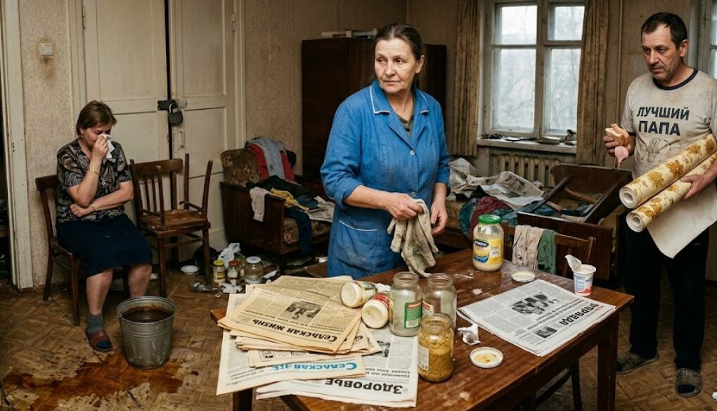 — Так вот, дорогая семья, — Надежда присела на край стола, отодвинув в сторону банку с засохшей горчицей. — План меняется. Люся, ты берешь тряпку и идешь мыть унитаз. Это очень отрезвляет и возвращает к реальности. Валера, ты берешь шпатель и начинаешь сдирать эти жуткие наслоения газет со стен в коридоре. А я… я займусь административной работой.