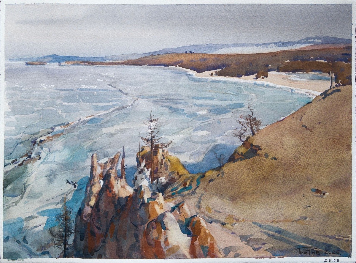 Байкал / Saraisky Beach. Baikal / 28x38 / Watercolor Plein air painting. Ветер был сильнейший, тучи сменились солнцем, и снегом в финале. Робко прятал тело в утёсах. #Pinax_Extra #palazzo_watercolor_paper #Baikal #пленэр #акварель #этюды #watercolor #Olkhon #Байкал #Ольхон