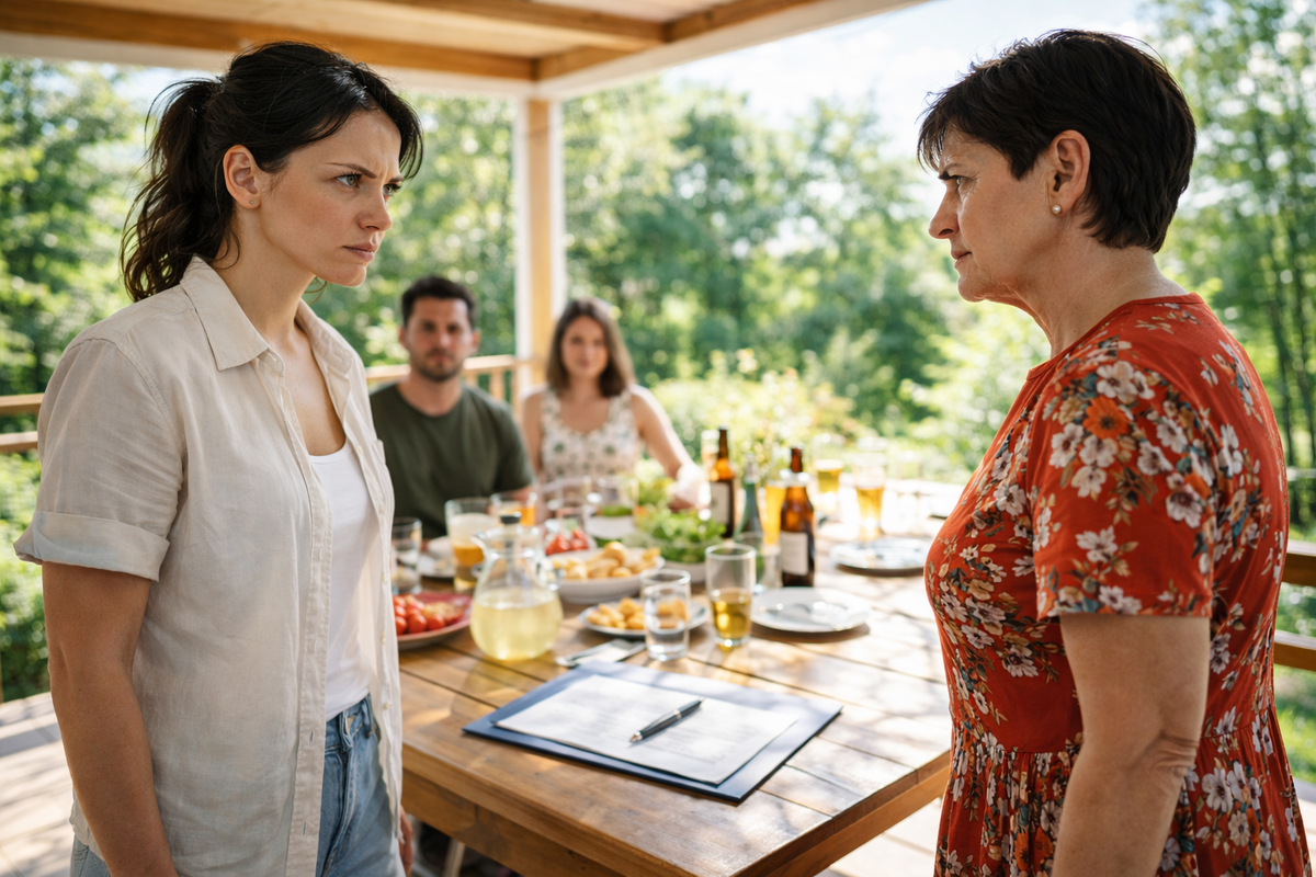 Во дворе сразу стало тише, хотя минуту назад там стоял обычный дачный шум: хлопали дверцы машин, кто-то тащил пакеты к дому, свекровь громко перечисляла, что куда нести, муж переговаривался с двоюродным братом, а у мангала уже крутились двое мужчин, будто приехали сюда не в гости, а к себе.