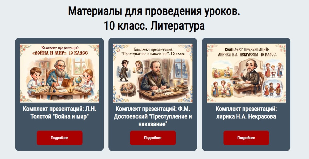 ). Пока мои прекрасные коллеги трудятся над созданием материалов для наших платных каналов, я создал еще два новых подраздела на нашем сайте 😎 Теперь к покупке доступны материалы, которые у нас лежали, но на сайте не были выложены: По первой ссылке доступны к покупке: 🤩 комплект презентаций по «Войне и миру» 🤩 комплект презентаций по «Преступлению и наказанию» 🤩 комплект презентаций по лирике Некрасова Полный комплект по каждому из них продается со скидкой 15%. Кроме того, купить можно и отдельные презентации из комплектов. По второй ссылке доступна к покупке: 🤩 презентация по рассказу И.А. Бунина «Господин из Сан-Франциско» Буду очень рад, если зайдете и оцените 🤩 Под этим постом собираю восторженные комментарии по красоте сайта и презентаций🤩🤩 🤩🤩🤩🤩🤩🤩🤩