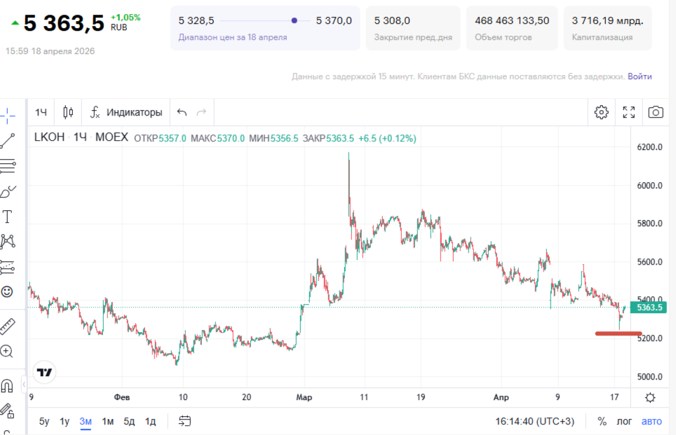 В последние дни, после очередного падения нефтяных цен на фоне новостей из Персидского залива наблюдаю привлекательные цены для покупки акций Лукойла с дивидендами, которые будут выплачены уже в начале мая. Акции Лукойла опускались ниже 5300 рублей, где, с моей точки зрения, уже находятся хорошие уровни для покупки, подчеркиваю, с учетом дивидендов 278 рублей, отсечка которых произойдет 30 апреля. Покупка акции по 5300 с дивидендами сейчас - это равносильно покупке по 5000 без дивидендов. На мой взгляд, это хорошая цена для хорошей акции. На графике видно, что в феврале цена опускалась и ниже - она была около 5200 рублей. Но, во-первых, тогда еще не было известно о сумме планируемых к выплате дивидендов (например, я ожидал меньше - около 200 рублей, а получилось около 300). Во-вторых, тогда российская нефть продавалась вдвое дешевле, чем даже сейчас, при уже упавших ценах. Почему Лукойл? Лукойл - на мой взгляд, единственная интересная акция нефтяного сектора с учетом сложившихся цен (к