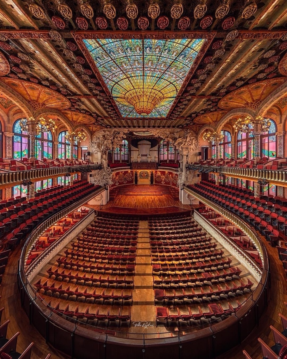 Представьте, что музыку можно не только услышать, но и увидеть... в каплях солнечного света, пробивающихся сквозь гигантский витражный купол. В самом сердце Барселоны спрятан «музыкальный ларец», где стены сотканы из хрусталя и мозаики, а потолок напоминает перевернутый золотой океан. Это Дворец каталонской музыки — единственный в мире зал, где главным дирижером выступает само Солнце.