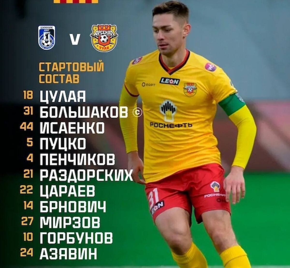 Тульский «Арсенал» начинает матч 29-го тура в Ярославле против местного «Шинника». Команды вышли на поле в следующих составах: «Арсенал»: Цулая, Большаков, Исаенко, Пуцко, Пенчиков, Раздорских, Цараев, Брнович, Мирзов, Горбунов, Азявин. «Шинник»: Митров, Лысцов, Корнюшин, Бозов, Маляров, Ланин, Галоян, Голубев, Самойлов, Порохов, Миронов. Стартовый свисток прозвучит в 17.00. 0+
