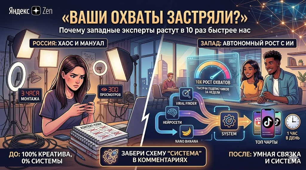 «Ваши охваты застряли?» Почему западные эксперты растут в 10 раз быстрее нас Давайте честно: обидно смотреть, как вы вкладываете душу в контент, монтируете часами, а на выходе получаете стандартные 300 просмотров. В это же время западные блогеры залетают в топ с полного нуля и набирают тысячи подписчиков за считанные недели. В чем их секрет? Они не умнее и не харизматичнее. Они просто нашли «лазейку» в алгоритмах, которая плевать хотела на новые фильтры соцсетей. Эпоха «автономного роста»