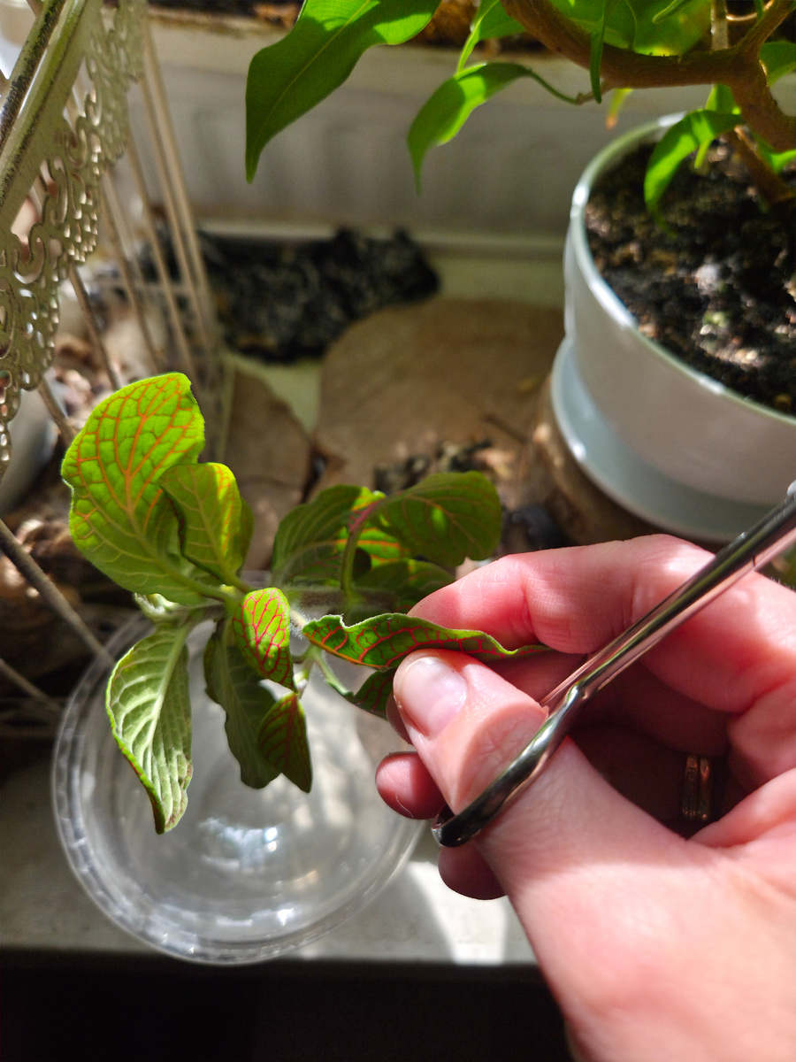 Первое черенкование комнатных растений, в апреле. Сегодня провела, спонтанно. С фиттонией, чтобы и размножить снова, и омолодить. Так почти каждый год делаю. Лет не 10 пока, но 8-9 точно и за это время когда-то купленное растение не пропало. Подготовила для укоренения кое-что. Первое - прозрачный пластиковый стакан, с крышкой. Заслуженный, редко такие попадаются, так что с прошлогоднего укоренения оставила. Далее - ножницы, обязательно острые, чтобы не сминали нежный стебель, а резали. Обрезаю вытянувшиеся сильные побеги, иногда их на две части делю. И у каждого черенка удаляю нижнюю пару листочков. Порой можно и больше удалить, если будут топорщиться так, что их не спрятать под укрытие. Удалять листочек можно полностью, с ножкой (не повреждая спящие пазушные почки), или ножку оставить. Она всё равно потом отвалится, если укоренение пойдет успешно. Еще иногда удаляют половину листовой пластинки, к примеру, если верхние листочки ещё молодые, а нижние мешают, направлены вниз или банальн