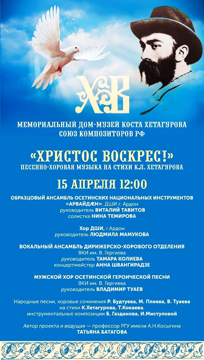 15 апреля в Мемориальном доме-музее Коста Хетагурова прошел музыкальный вечер под названием «Христос воскрес!», посвященный песенно-хоровой музыке на стихи великого осетинского поэта Коста Хетагурова. Мероприятие было организовано Союзом композиторов РФ.