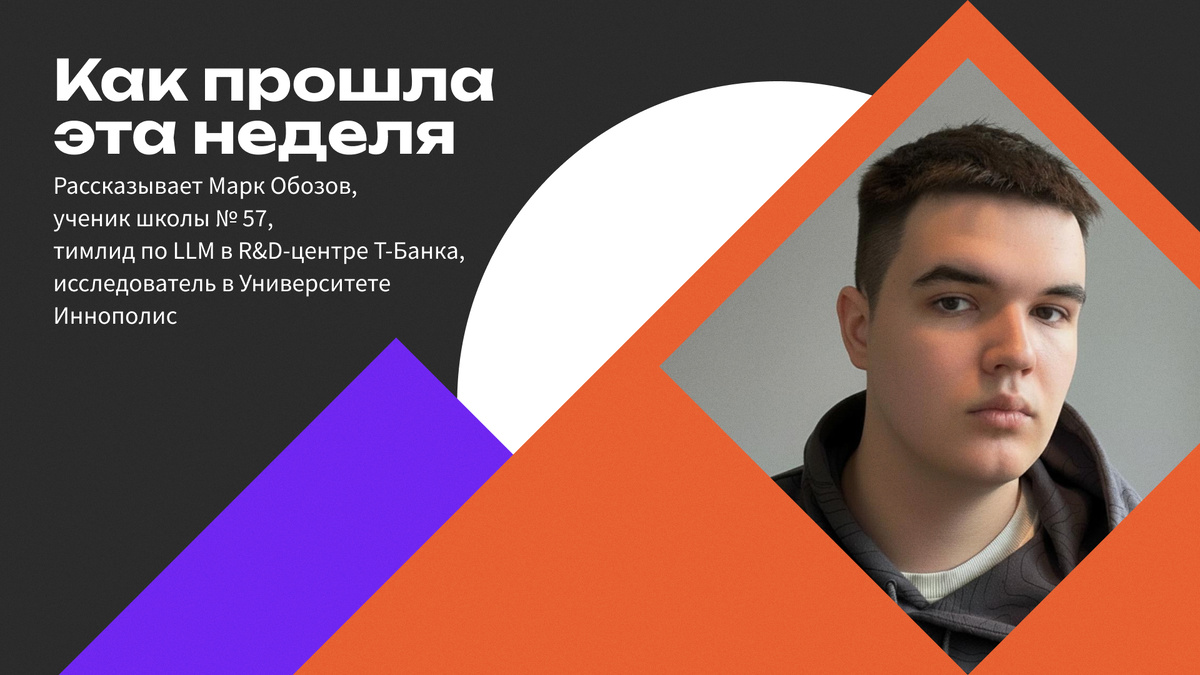 Сегодня в рубрике «Как прошла эта неделя» о своей жизни рассказывает 16-летний ученик московской школы № 57, руководитель исследовательской команды в R&D-центре Т-Банка, исследователь в Институте ИИ Университета Иннополис Марк Обозов.
