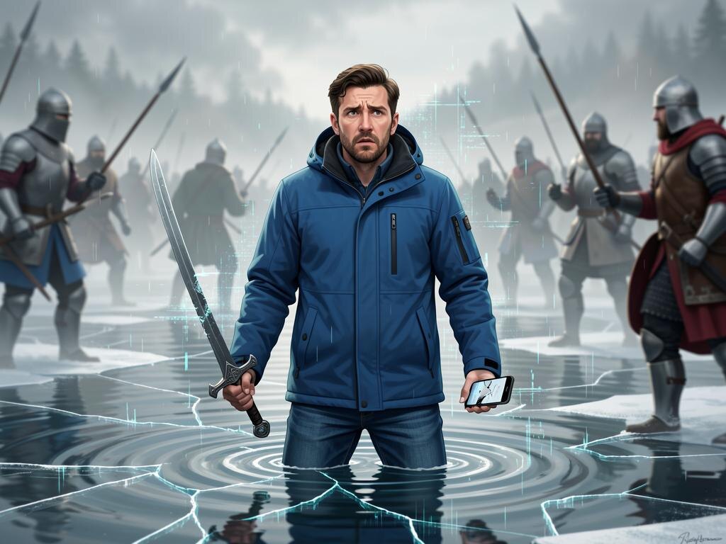 И вот тут, посреди льда, между копьями, щитами и свистом стрел, меня неожиданно накрыло: я стою внутри собственного будущего романа. Того самого, который ещё не написан, но уже безнадёжно устарел, потому что реальность оказалась громче, грязнее и… человечнее, чем мой аккуратный план.