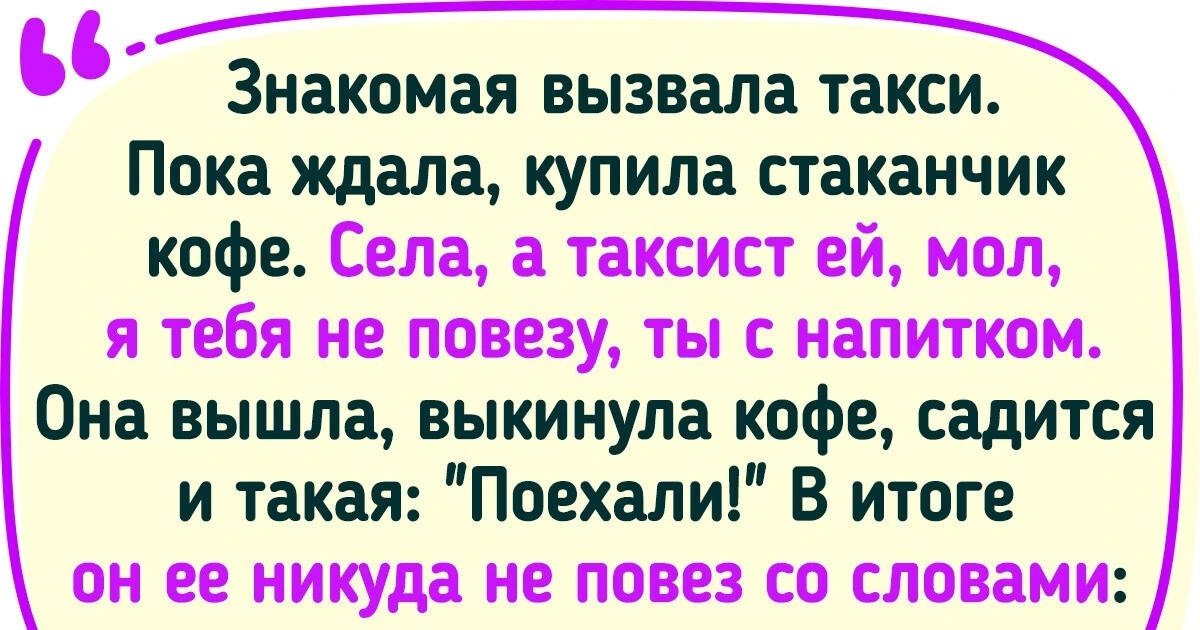 Знакомая вызвала такси, потому что пошел дождь. Пока ждала, купила стаканчик кофе в автомате. Села, а водитель ей, мол, я тебя не повезу, ты с напитком. Она говорит: «Стаканчик закрыт, не прольется». Водитель отказывается: не повезу, и все тут. Она вышла, выкинула кофе в урну, села обратно и такая: «Поехали!» В итоге он ее никуда не повез со словами: «Ты мне настроение испортила». © Wildwildworld / Pikabu