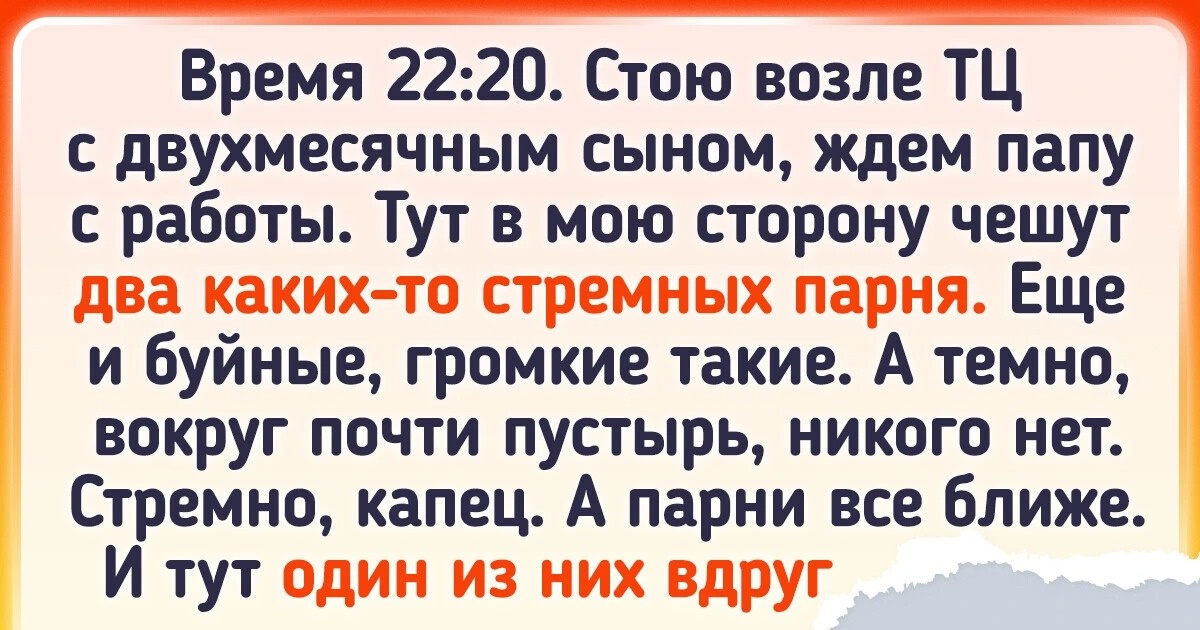 Время 22:20. Стою возле ТЦ с коляской, там сынок маленький спит, ждем папу с работы. Тут ко мне идут вразвалочку два парня хулиганской внешности. Еще и буйные такие. Огляделась, а вокруг-то никого. Стало мне дико стремно. Парни приближаются. И тут один вдруг говорит другому: «Сейчас потише говори, в коляске наверно ребенок спит». Так приятно стало на душе. Как же все-таки обманчива бывает внешность.