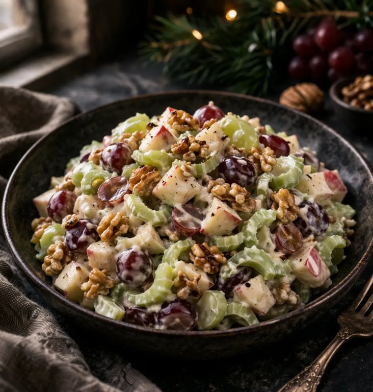 Этот салат родился в стенах легендарного отеля Waldorf Astoria в Нью-Йорке в 1800-х годах. Изначально рецепт был лаконичным — только яблоки, сельдерей и майонез. Но со временем кулинары добавили сочные акценты: виноград, орехи и свежую зелень. Теперь это блюдо — символ уютного праздника и отличный способ подать свежие фрукты и орехи в новом формате.