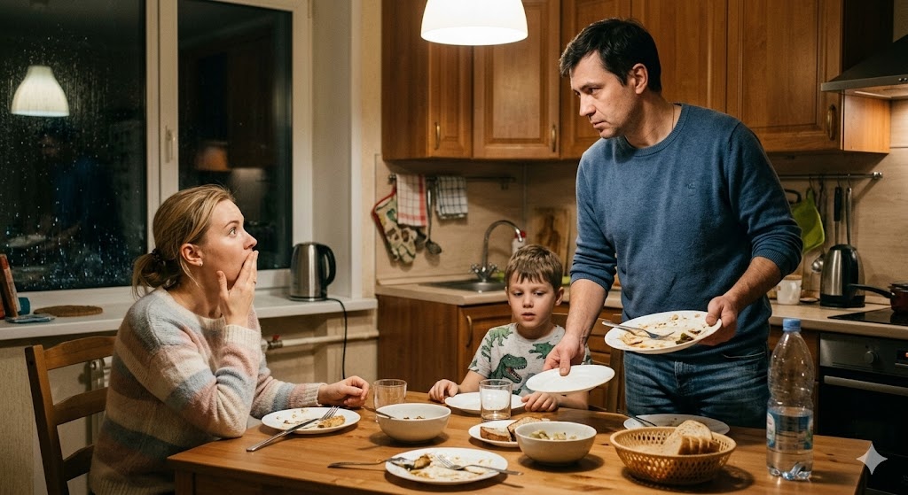 Лена замерла. Вилка в ее руке дрогнула и со звоном опустилась на стол. Она медленно подняла глаза на сына. В ее взгляде не было злости — только бесконечная, глубокая, парализующая боль. Это «эй». Это приказное «убери». Это абсолютное обесценивание ее как человека, как матери.