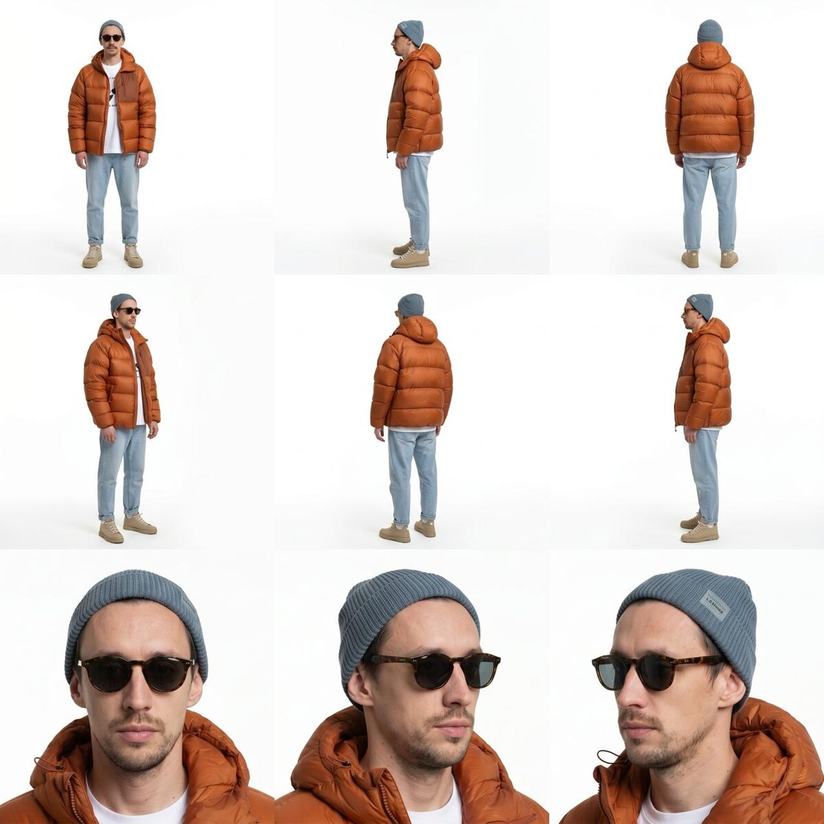 ? Вот кейс, пробовал сегодня с нашей ИИшкой (использует Google Banana 2). Задача была - сгенерить фотки с человеком, чтобы человек на всех фотках на всех ракурсах выглядел реалистично. Если просто грузить одну фотку - ИИ может тупить и дорисовывать чего нет (предмет одежды или шапку не ту или выражение лица менять). Поэтому я использовал лайфхак - сделать сториборд на 9 фоток в разных ракурсах. Исходные фотки для первого промпта будут в комментах. Промпт (можно доработать под себя, у меня не было норм референса с лицом, поэтому я взял 2 фотки с лицом из видео на другом фоне в другой одежде): Используй загруженное изображение мужчины в оранжевой куртке как референс внешности и идентичности персонажа. Создай чистый лист референсов персонажа в сетке 3x3 на абсолютно белом бесшовном студийном фоне. Без рамок, без обводок, без линий сетки, без подписей, без текста, без реквизита, без теней, без других людей. Только аккуратная сетка 3x3 с равномерными промежутками между изображениями