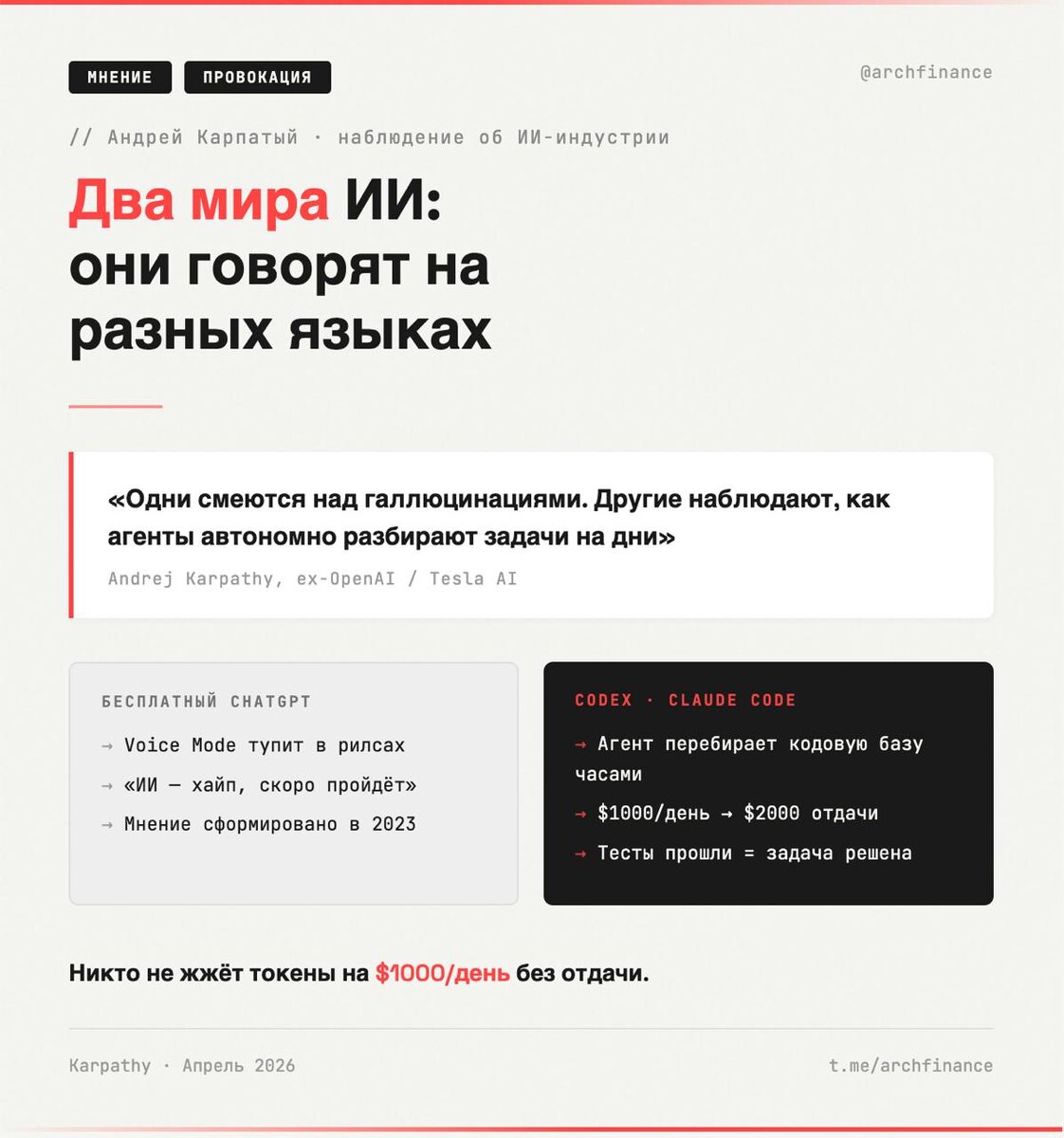 Одни посмеялись над бесплатным ChatGPT и его голосовым режимом и решили, что «ИИ — хайп». Другие (мы, например) платят за Codex и Claude Code и наблюдают, как агенты автономно разбирают задачи на недели. Разрыв растёт, потому что в технических областях есть жёсткие метрики — тесты прошли или нет. Туда идут деньги. Туда идёт прогресс. Никто не жжёт токены на $1000/день без отдачи на $2000. Это не вера — арифметика. #ИИ #ClaudeCode #AgenticAI — 📱 Макс · 📖 Дзен · ✈️ Telegram · 🌐 hr-s.ru