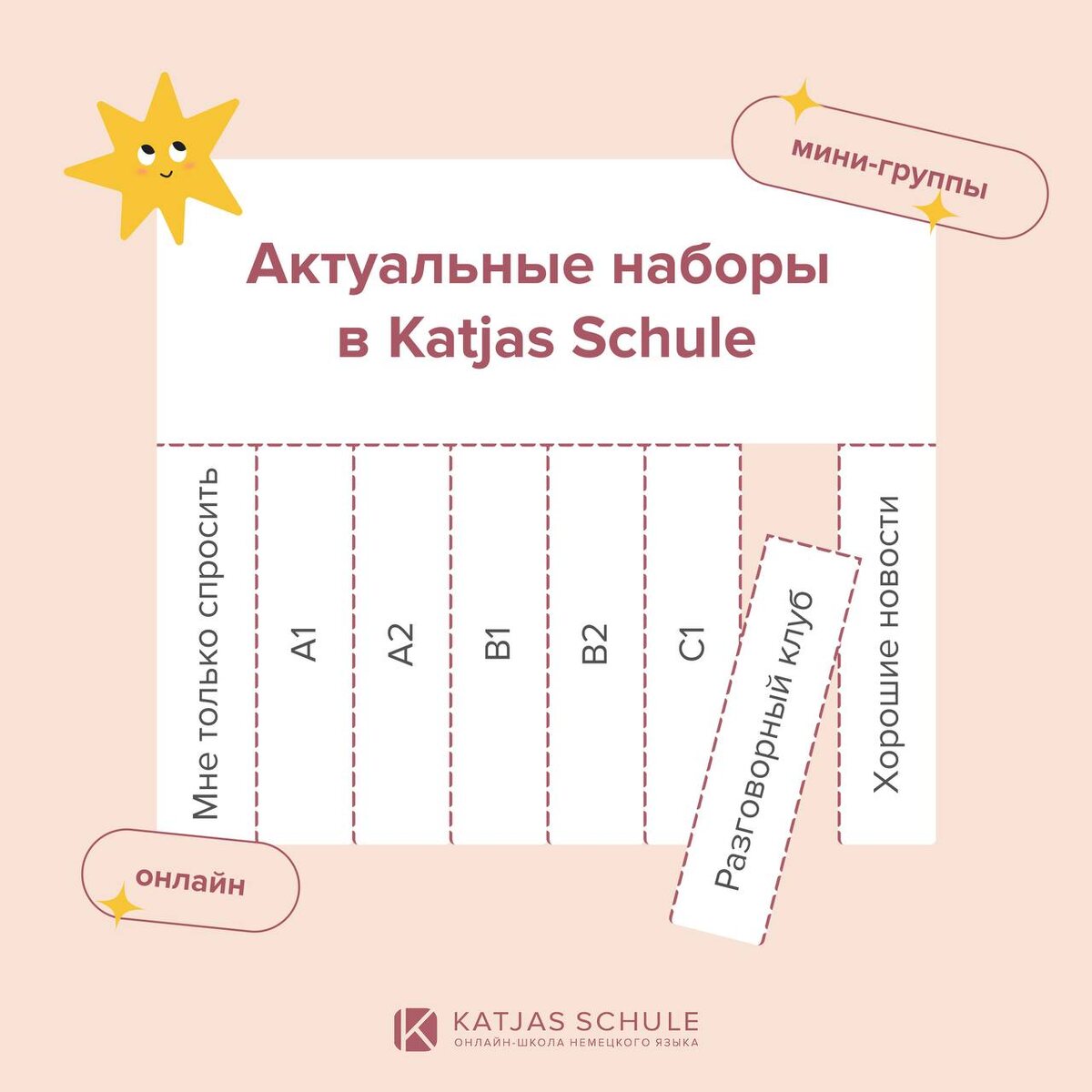 🇩🇪 У нас есть целый пост с нашими принципами и ценностями. Если они вам откликаются – приглашаем вас на классические курсы немецкого 😊 🔡🔢Вторник, четверг, 21:00 🔡🔢Вторник, пятница, 18:00 🔡🔢Вторник, четверг, 11:00 🔡🔢Вторник, четверг, 19:00 🔡🔢Понедельник, среда, 18:30 📻 Курс по аудированию "Хорошие Новости": понедельник, 20:30 (подробно здесь) Время московское ◀️ Условия: мини-группа 4-5 человек, онлайн ◀️ Занятия дважды в неделю по 1,5 часа ◀️Стоимость (30 занятий) – 33 400 ₽; возможна оплата 2 частями Подробно про уровни читайте здесь, а ещё у нас есть тест, который поможет определиться с группой. Если среди актуальных групп нет нужного вам уровня – дайте нам знать 🤍 Для записи пишите в нашу Службу заботы @Katjas_Admin_bot 🐶