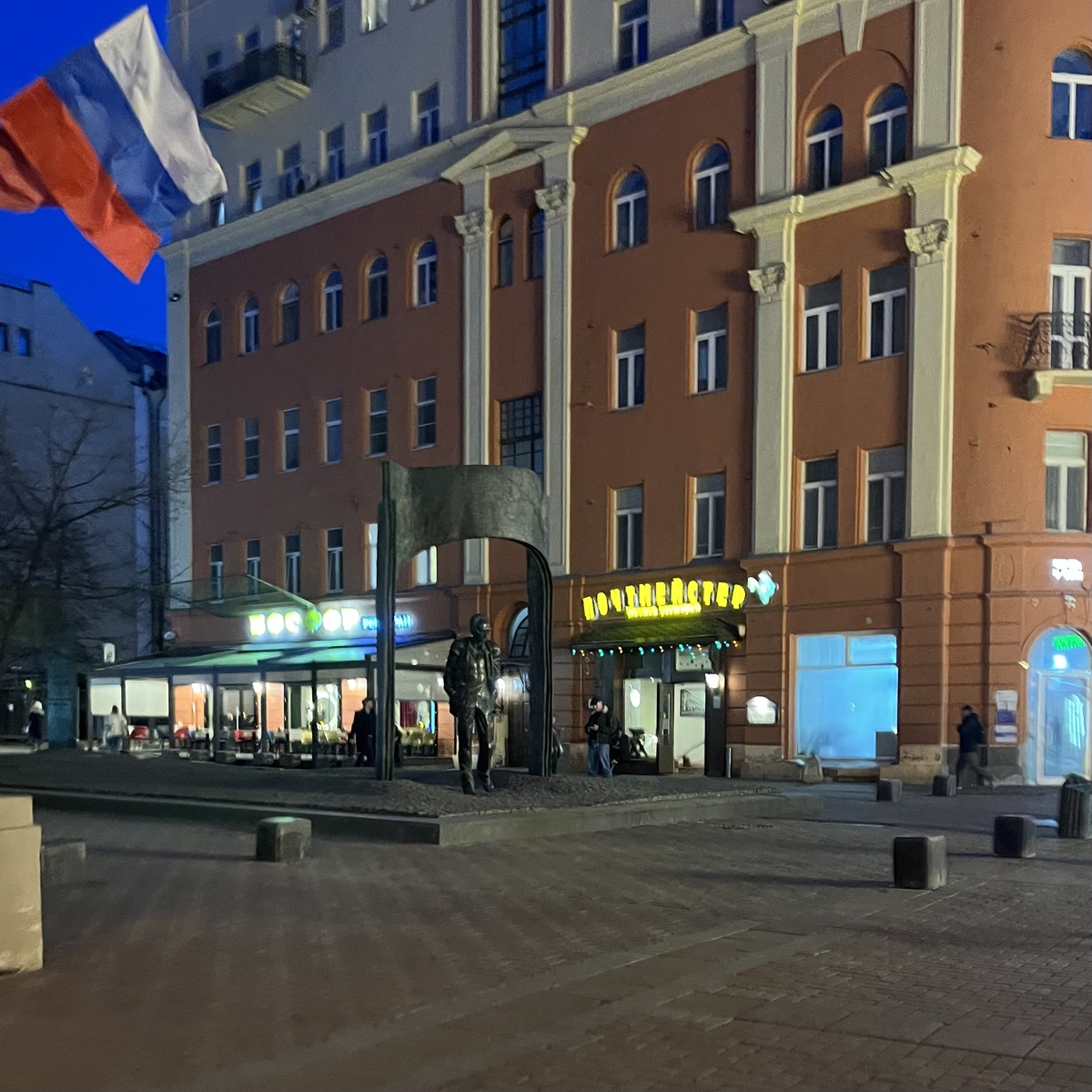 Шел я в другое заведение – Jules Zang, но туда не пустили, сказали – закрываются. На такие случаи у меня всегда есть запасной вариант, и этим вечером таким вариантом был ресторан пивной немецкой кухни «Почтмейстер», который работает с 2002 года. Кстати, в прошлом году заведение ушло на «ремонт», и тут же поползли слухи, что закрылся навсегда, – но нет, очухался старичок, выжил и вновь распахнул свои двери. Расположение ближе к Садовому и станции метро «Смоленская», на пересечении Арбата и Плотникова переулка, рядом с памятником Булату Окуджаве. Вокруг один недорогой общепит: турецкий «Босфор», азербайджанский Caspian, ирландский Ulysses Pub, советская чебуречная «СССР», мясной «The Бык», винный 1870 Abrau-Durso, а еще отделение Почты России за углом. С улицы «Почтмейстер» выглядит так, как и должен выглядеть ресторан в возрасте 24 лет: желтая вывеска, рыжий фасад, меню рядом с входом, небольшое окно и курящая сотрудница на лавочке.
