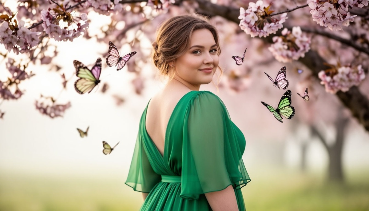 «Портрет девушки plus‑size в элегантном зелёном платье. Полуракурс, лёгкая улыбка, взгляд через плечо. Двойная экспозиция: поверх изображения — силуэты цветущих ветвей и бабочек. Мягкий рассеянный свет, пастельные тона. Атмосфера нежности и лёгкости. Ultra HD, высокая детализация ткани платья и волос» (498 символов) Вариант 2 (урбанистический, стильный):