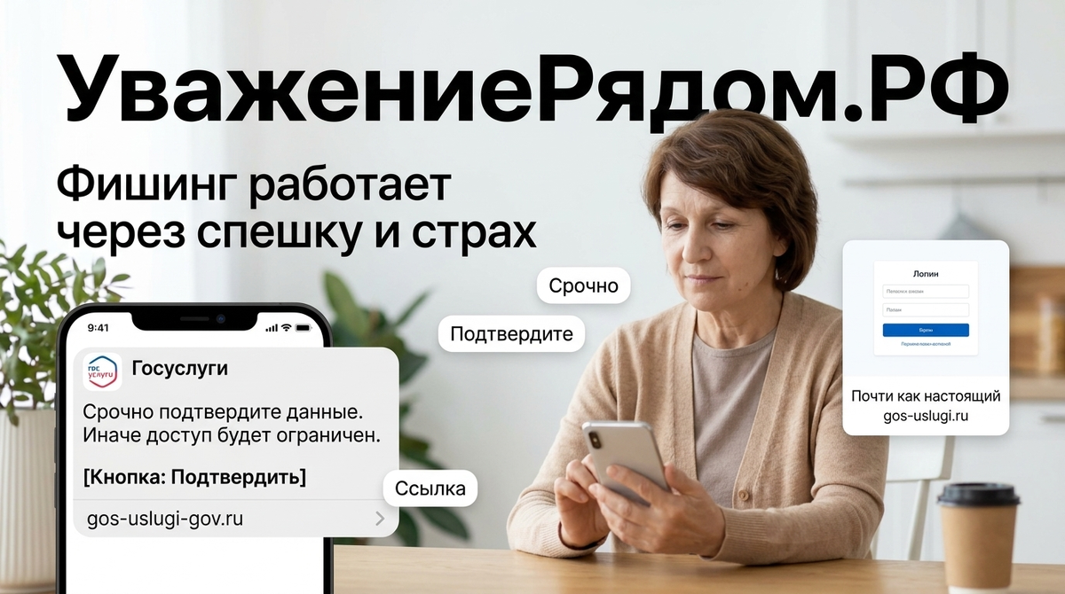Что такое Фишинг? ❗️ Фишинг — простой обман, на который попадаются даже осторожные люди Фишинг — это когда мошенники притворяются официальными службами: банком, Госуслугами, Мос.ру, почтой. Они присылают СМС или сообщение со ссылкой и ведут на поддельный сайт, который выглядит почти как настоящий. ⚠️ Важно Сайт может быть сделан очень похоже. Даже адрес может отличаться всего на одну деталь, например: gos-uslugi.ru вместо настоящего gosuslugi.ru. Глазами это заметить сложно. 🔴 пугают: «аккаунт заблокирован», «обнаружена ошибка» 🔴 торопят: «срочно подтвердите» 🔴 просят ввести логин, пароль или код из СМС Если это произошло — почти всегда это мошенники. Самая надёжная защита (очень простая) ✅ сохранить важные сайты в Избранное 🔴 Госуслуги 🔴 Мос.ру 🔴 банк ❗️ И заходить на них только через избранное, а не по ссылкам из сообщений. 👌Если сайт открыт из избранного — адрес правильный. 🤲 Если просят перейти по ссылке — лучше не открывать. Запомните главное Фишинг — это не про компьютеры