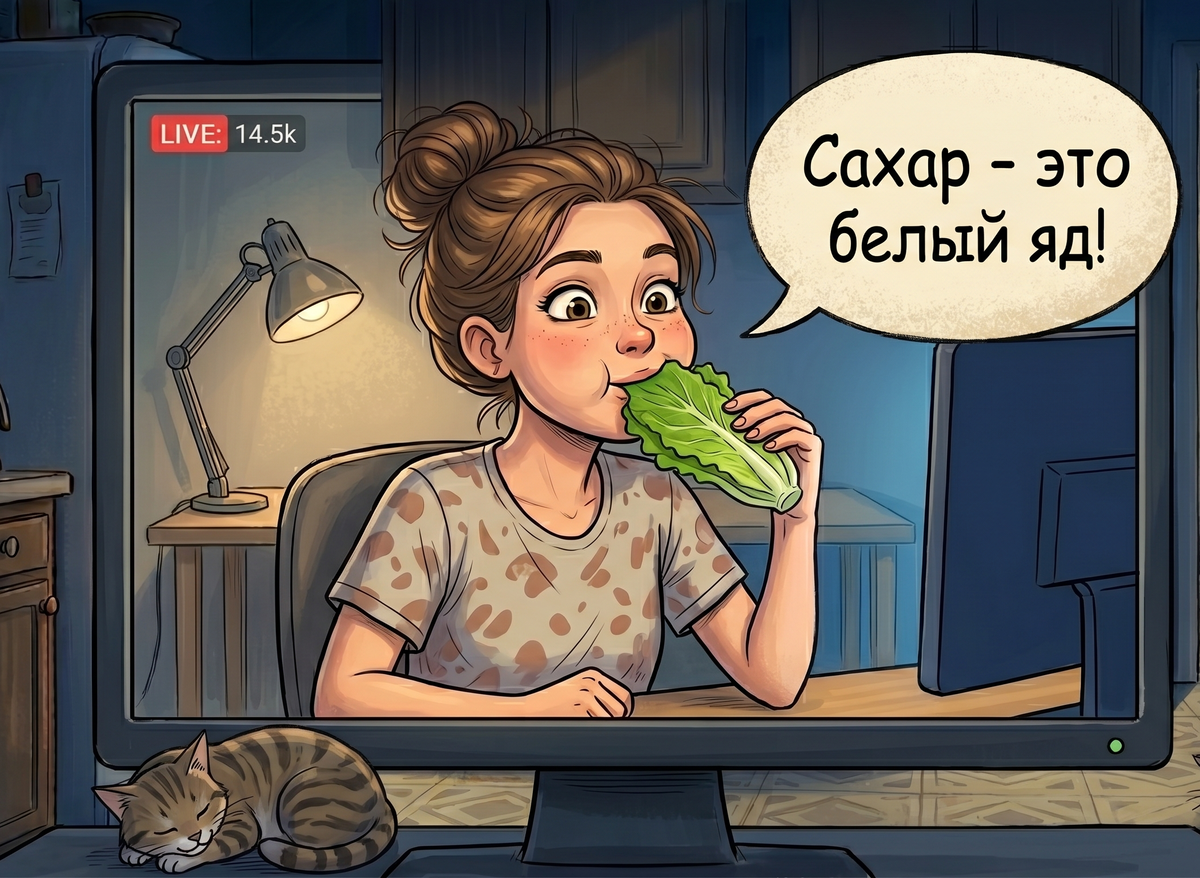 Началось всё с того, что я посмотрела на себя в зеркало в примерочной и поняла: либо зеркало бракованное, либо я превращаюсь в уютный комод. В это же время в соцсетях мне попалась блогерша — девица лет двадцати, которая с лицом святой мученицы жевала лист салата и уверяла, что «сахар — это белый яд», а «глютен — проклятие человечества». — Всё, — сказала я мужу. — С завтрашнего дня мы переходим на осознанное питание. Больше никаких булок, колбасы, грудинки и пельменей. Только семена чиа, киноа и духовный рост. Муж посмотрел на меня так, будто я сообщила, что ухожу в монастырь босиком.