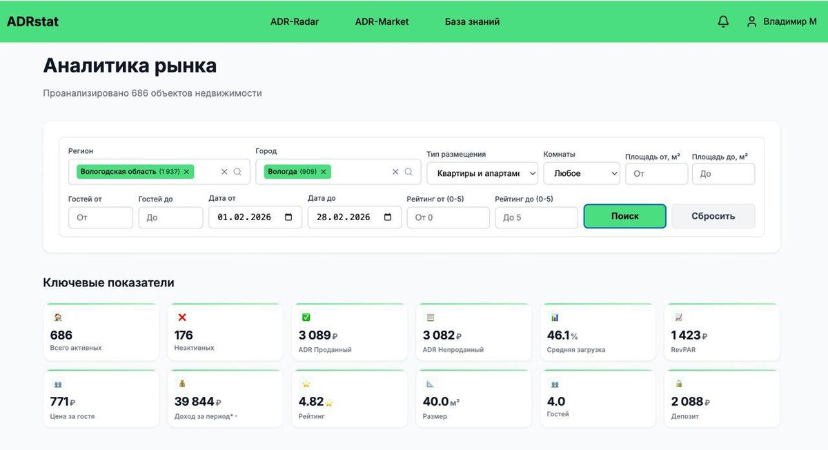 Я проверил цифры. Сначала я поделился в канале итогами февраля. Вот пост, если пропустили: https://dzen.ru/media/ceo2pillows/90-liudei-skryvaiut-etot-fakt-o-svoem-biznese-69db5c0517b31f680b9172f5 И началось горячее обсуждение. Посыпались предложения в духе: «Может, стоит сдавать дешевле, тогда загрузка будет 80%?» Вот цитата: Алексей, а вы делали анализ: если бы вы сдавали по цене рынка, а не выше и при этом загрузка была бы например, 80%, понятно что переменные расходы были бы выше, но было бы это в конечном итоге выгоднее или нет? 45% загрузка, средний чек на 500 руб выше, Х расходов и У прибыль. Или 80% загрузка, чек рыночный, A расходов и B прибыль. Какая разница в прибыли в первом и втором варианте ? Или, если оба в минусе, то где минус меньше? Но тут пришли цифры от профессионалов После публикации поста мне пишет в личку представитель сервиса ADRstat. Присылает статистику по рынку Вологды за февраль. Давайте сопоставим. Важное уточнение В нашей системе Travelline цена - э