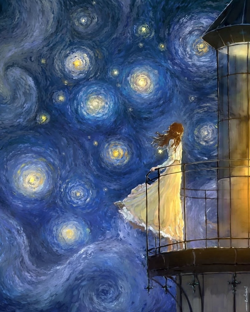 • Герои без лиц: Часто лица его персонажей едва прорисованы или скрыты. Это сделано специально — чтобы каждый из нас мог узнать в этом человеке себя. Вы — тот самый парень на крыше, который смотрит на Млечный Путь. Вы — та самая девушка, читающая книгу в свете магического фонаря.