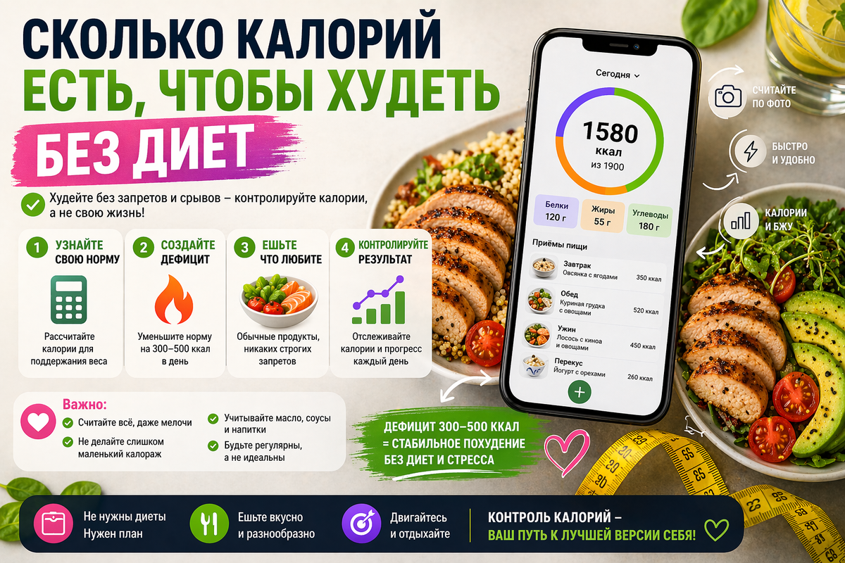 Например, в Caloryx можно: 👉 Это помогает держать дефицит без стресса. Чтобы худеть без диет: 👉 И ты будешь худеть без жёстких ограничений