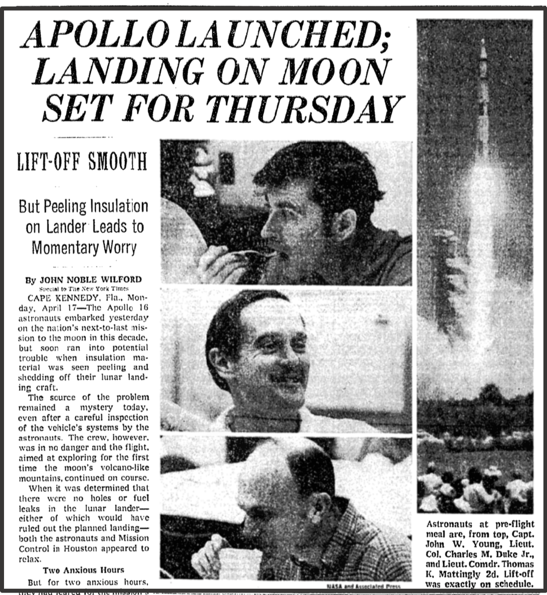 Планируемая 12-дневная миссия для капитана Джона У. Янга, лейтенант-коммандера Томаса К. Мэттингли Второго (ВМС) и подполковника Чарльза М. Дьюка-младшего (ВВС) началась вчера в 12:54 дня с точностью до миллисекунды от графика, который должен привести к посадке на Луну в четверг и выходу на поверхность несколькими часами позже.