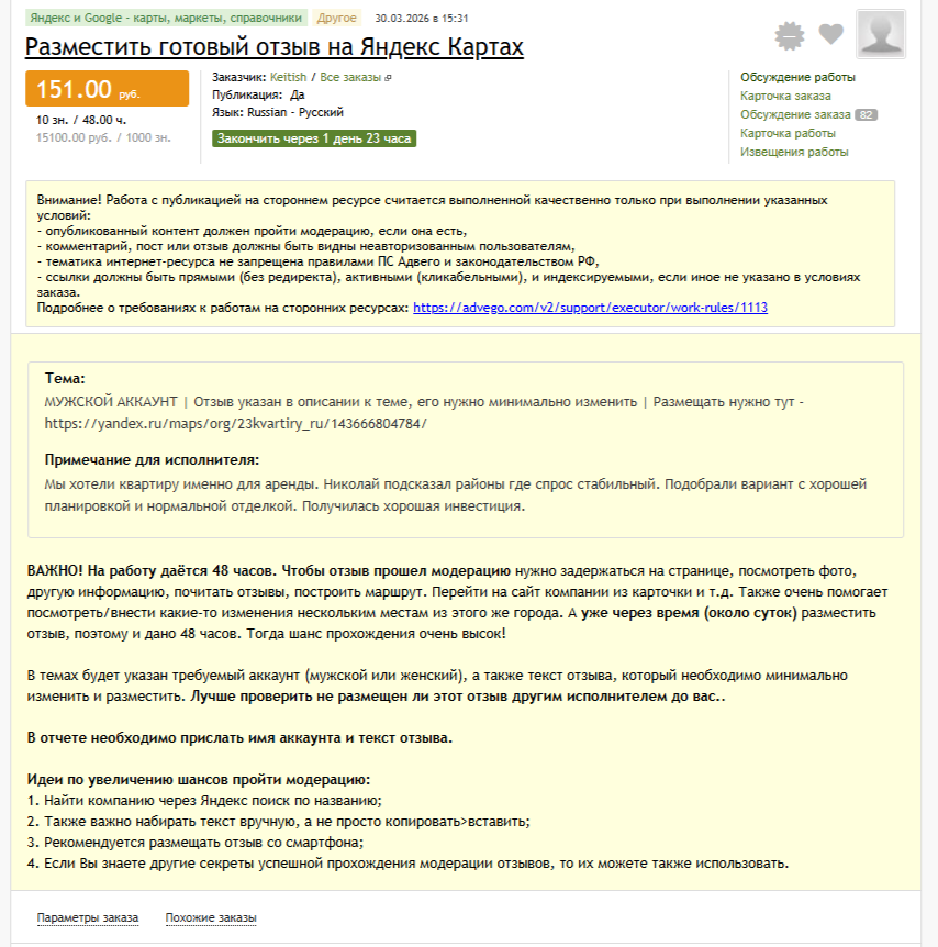 Цена задания — 151 рубль, довольно неплохо для человека, который только начал. Заказчик подробно расписал, как всё правильно сделать: Я сначала минут 10 просто листал страницу компании, смотрел, какие есть объекты, кто что пишет, какие районы популярнее. Понравилось, что всё по-человечески, без давления.