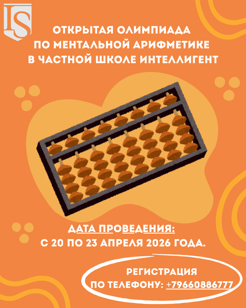 🧮 Открытая олимпиада по ментальной арифметике в Частной Школе ИНТЕЛЛИГЕНТ🏆 Приглашаем юных гениев проявить свои таланты и скорость мышления! Наша цель - популяризация ментальной арифметики и мощная мотивация детей к обучению. ❗️Основная информация: 🗓 Дата проведения: с 20 по 23 апреля 2026 года. 📍Место: г. Солнечногорск, ул. Банковская, д. 15 📍Место: г. Солнечногорск, мкр. Рекинцо, ул. Молодежная, д. 1. Организатор: Частная Школа ИНТЕЛЛИГЕНТ 📝 Условия участия: ✔️ К участию приглашаются ученики любых школ и частных инструкторов, обучающиеся по любой методике. ✔️ Участники делятся на возрастные группы и регистрируются на соответствующий уровень заданий. ❗️Важно: каждый участник должен иметь при себе собственный абакус. 📊 Категории и регламент: Соревнования проходят в 3 раунда, каждый из которых длится по 5 минут. Предусмотрено три основные категории: 1️⃣ «Братья»: ментальный счет (Анзан) 1-значных чисел, а также счет на абакусе 2-значных и 3-значных чисел в столбиках. 2️⃣ «Друзья»
