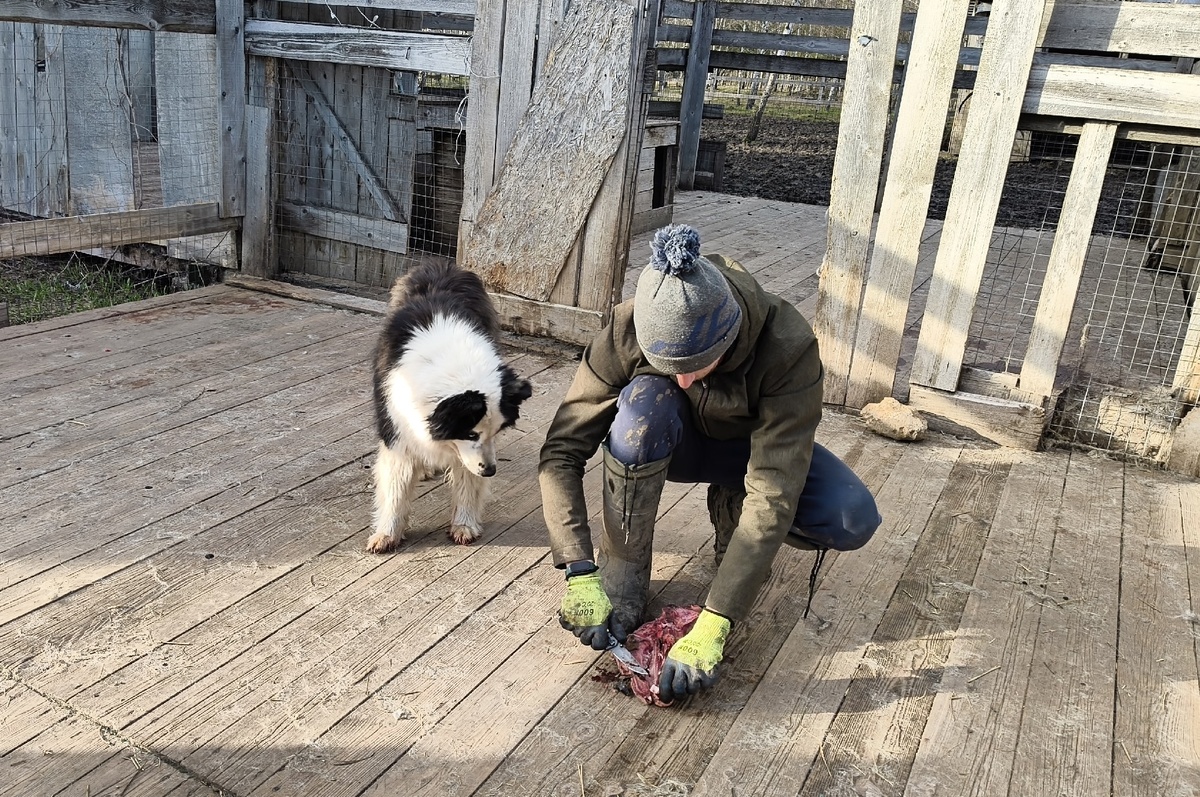 Одно из особых удовольствий для меня как для хозяйки это давать питомцам пробовать разные вкусы и подыскивать для них интересную еду (возможно, потому что сама люблю все новое и необычное). Разумеется, в рамках дозволенного для их вида питания. И сегодня у наших собак был по-настоящему королевский ужин: каждому досталась по целой половине телячьей головы! У Квас потекли слюни еще за пару метров до того, как он подошел к своей порции. В вольере все и вовсе обезумели (а это состояние, как вы понимаете, в стае очень заразно). Угомонить собак было практически невозможно, да я и не пыталась. Они так радовались, что не хотелось их усмирять. Любопытно было наблюдать за поведением каждой собаки, когда она получала свою порцию. - Так делают умные собаки, - прокомментировал Ваня, показывая на Иргу. Она за пару минут выела мозг и язык и продолжила поглощать сначала мягкие части. - А так – не очень, - улыбнулся Ваня, смотря на Багги, который начал грызть голову с носа – далеко не самой вкусной и,