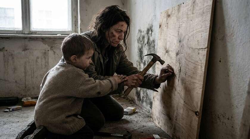Мальчик помедлил, но подошел. Его маленькие, огрубевшие ладони прижали фанеру к стене. Анна начала забивать первый гвоздь. Удар — и по всей комнате разнесся гулкий, живой звук. Она промахивалась, попадала по пальцам, ругалась сквозь зубы — не изящно, по-дизайнерски, а коротко и зло.