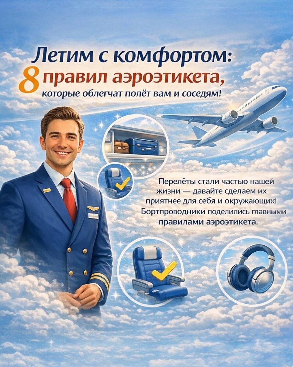 Девочки и мальчики, аэроэтикет — это не снобизм. Это инструмент выживания в «банке с сардинами». Если каждый из нас начнет уступать подлокотник, надевать наушники и не пихать жвачку в карман — небо станет чуточку добрее.