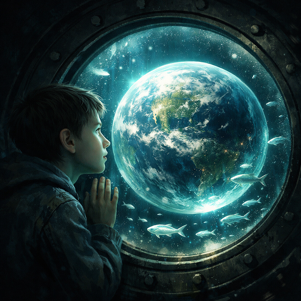 Вдруг кто-то зашёл, и тёмное помещение на короткое время озарилось светом из коридора. Мальчик замер, затаил дыхание. Шаги. Громыхание — видно, пришелец ищет что-то в одном из ящиков. Тишина. Вероятно, нашёл или размышляет то ли он взял. Шаги. Двери опять открылись, а затем снова потемнело. Мальчик высунулся из-под своего укрытия и огляделся. Вдруг зажужжало справа, это тяжелые шторки иллюминаторов стали подниматься вверх. Голубовато-зеленый свет озарил удивленное лицо мальчика, увидевшего через открытые окошки, как по зеленоватой “воде” проплыл косяк серебристых рыб, похожих на дротики для метания. Мальчик подбежал к иллюминатору и прильнул к его холодной, запотевшей от дыхания, поверхности. Земля! Синяя от океанов и белая от облаков, с зелеными очертаниями Евразии и Африки огромная бочина шара, погруженного внутрь толстого и полупрозрачного пузыря атмосферы. А вокруг амниокосма, мутная “космическая жидкость”, в которой плавали удивительные “рыбы”: перламутровые, радужные, острые и плоские, с плавниками и даже с лапками, маленькие стайные и где-то очень далеко огромные, как мифические морские чудовища, одинокие гиганты, наподобие того старого больного кита, упавшего на Отланбург. Казалось, что ты смотришь в волшебный аквариум, но аквариумом (или, скорее, аэроквариумом) можно было назвать Землю и другие планеты с атмосферой, но никак не бескрайний космический океан, полный множества опасных чудовищ и диковинных планет, ярких звезд, коралловых астероидов, кочующих по течению кустиков водорослей, монструозных раковин, в темном нутре которых ничтожные человеки могли бы разместить хоть сотню Отланбургов, и много чего ещё, что до сих пор не открыл сухопутный землянин, лишь не так давно выбравшийся из своего пузыря. Мальчик уже знал об устройстве вселенной из уроков физики, но что почувствовал Гагарин, который впервые оказался в амниокосме и увидел земной шар в пузыре? Какой восторг от масштабов шара и трепет перед хрупкостью пузыря испытал первый космонавт?! А каких рыб он увидел первыми? Может, огненно-красных веновиков или серебристых дротов? А, может, он увидел где-то там в темнеющей дали очертания кита, спрута или рака-отшельника? Одно понятно было мальчику, что храбрый Гагарин нисколько не испугался далеких космических чудищ.