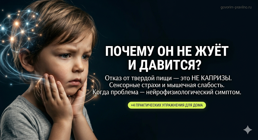 Отказ от твердой пищи и нарушение жевания — это сложный нейрофизиологический симптом, который чаще всего связан со слабостью артикуляционного аппарата или нарушением сенсорной интеграции в ротовой полости, требующий не уговоров и принуждения, а грамотной коррекции мышечного тонуса и постепенной десенсибилизации.