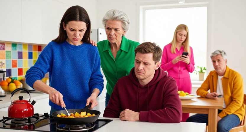 Лена медленно поставила сковороду на подставку и обернулась. За столом сидели все как на подбор: свекровь с ровной спиной и губами, поджатыми в нитку, свёкор Юрий Николаевич с привычным видом человека, который пришёл в этот мир по недоразумению и теперь терпит, муж Дима с лицом несвежего офисного мученика, и Катя — в дорогом спортивном костюме, с новым маникюром, при этом изображающая жертву обстоятельств.