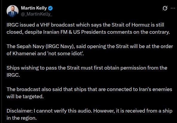 'Hormuz closed — enemy vessels targeted' Unverified audio but ship confirms receiving this message — Head of Advisory at EOS Risk Group & Middle East maritime analyst Martin Kelly
