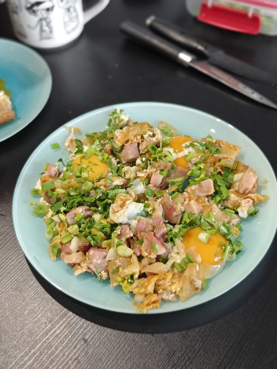 короткий рецепт корейской яичницы с белорусским салом, кимчи, чесноком и луком (на 1–2 порции, ≈1 большая порция