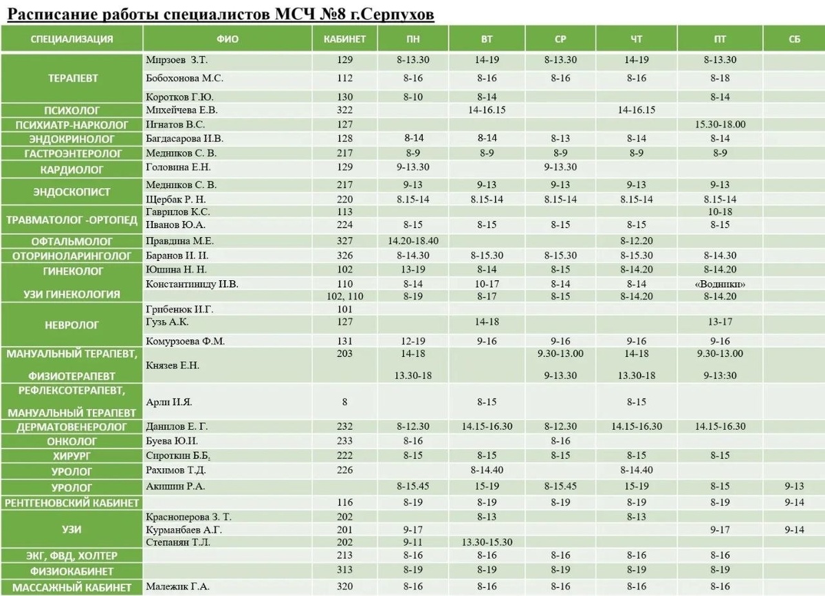 ГРАФИК РАБОТЫ СПЕЦИАЛИСТОВ МСЧ №8 на следующую неделю - с 20.04.26 по 25.04.26