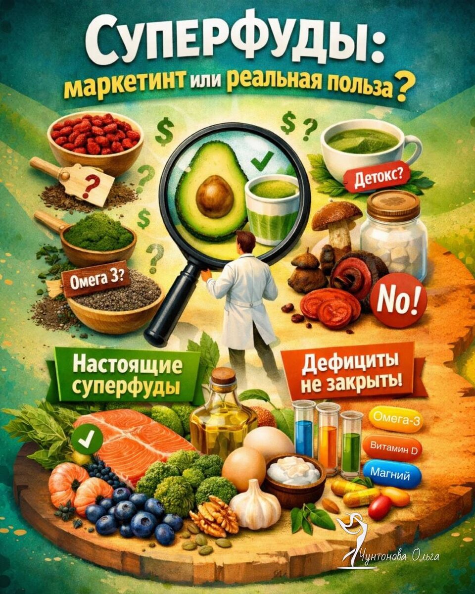 ? Термин «суперфуд» не является научным. Он не используется в клинических рекомендациях и не отражает объективную ценность продукта. Это маркетинговое определение, которое активно применяется для повышения продаж и формирования у потребителя ощущения «уникальной пользы». Разберём популярные продукты с точки зрения нутрициологии и доказательной базы. Годжи Содержат антиоксиданты, но их концентрация сопоставима с доступными продуктами — черникой, шиповником, смородиной. Клинического преимущества не имеют. Вывод: функциональной уникальности нет, переплата обусловлена маркетингом. Спирулина Источник белка и микроэлементов, включая железо. Однако рекомендуемые дозировки (2–5 г в сутки) не оказывают значимого вклада в суточное потребление нутриентов. Вывод: может использоваться как дополнительный источник, но не имеет существенного влияния на рацион. Авокадо Содержит мононенасыщенные жирные кислоты, калий, фолаты и пищевые волокна. Связан с улучшением липидного профиля при регулярном уп