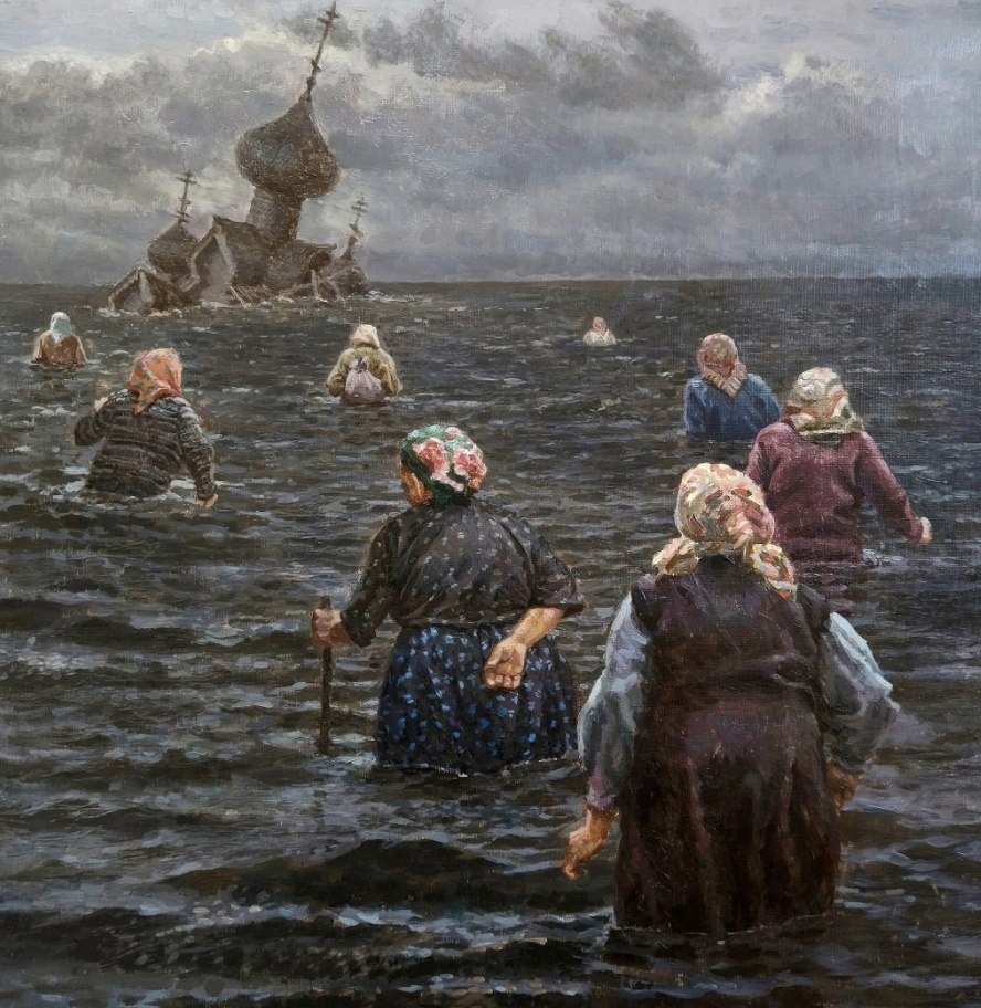 Картина «Слезохранилище» будто такой слепок коллективной памяти, когда трагедия это не крик, а тихое рыдание. На первом плане спины старух в платках. Они идут в холодной, разлившейся воде. Кто опирается на тонкую палку, а кто на собственную решимость. Неподалёку тонет деревянная церковь. Луковичные главы клонятся, небо тяжёлое, серое, словно на грани бури. Всё пространство превращается в хранилище утрат. Церковь, частично ушедшая под воду, напоминает корабль‑призрак. На самом деле, самое замечательное здесь, это что можно бесконечно рассуждать о «Слёзохранилище» Андрея Шатилова, его метафоричности, символизме и прочем, и всё это, несомненно, имеет место быть. Но в основе полотна лежит вполне материальный, земной, исторический образ, затопление российских поселений и городов при строительстве ГЭС в советскую эпоху. Почитайте про Клязин и Калязинскую колокольню, русская Атлантида как она есть. А вообще про затопленные города России можно будет потом отдельно поговорить. Холодная па
