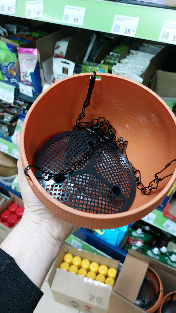 В комплекте идет металлическая цепочка с крючком для подвешивания. На дне предусмотрено сливное отверстие с резиновой пробкой, что позволяет использовать его как со сливом лишней влаги, так и без (например, внутри помещения). Изделие произведено в России. Цены не было, достала из коробки.
