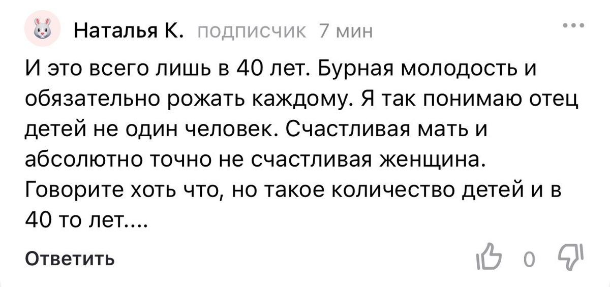 И это всего лишь в 40 лет. Бурная молодость и обязательно рожать каждому. Я так понимаю, отец детей не один человек. Счастливая мать и абсолютно точно не счастливая женщина. Говорите хоть что, но такое количество детей и в 40-то лет...