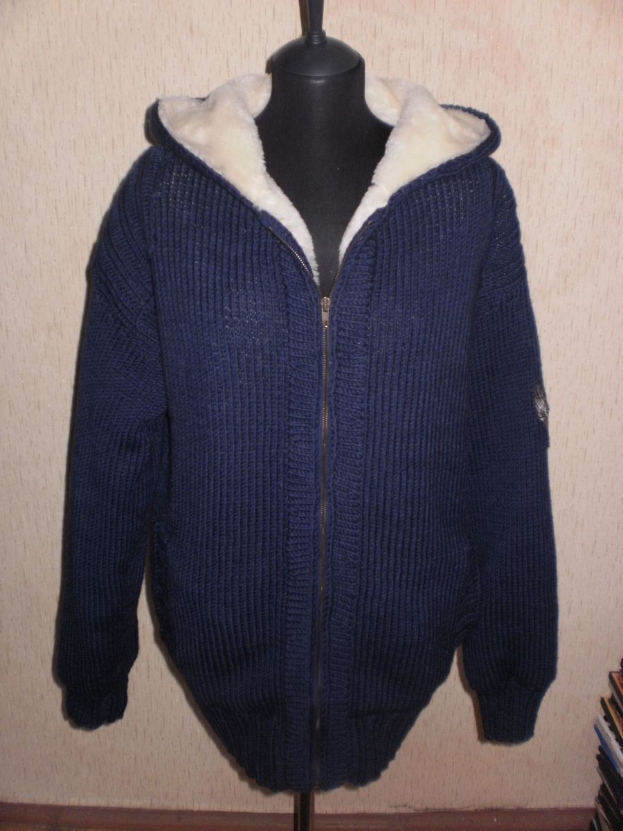 Эту работу я выполнила всего три раза, но от первой петельки до последнего шва сама. Вязаная куртка на меху, имеются прорезные карманы, вещь неброская и хорошая для межсезонья и