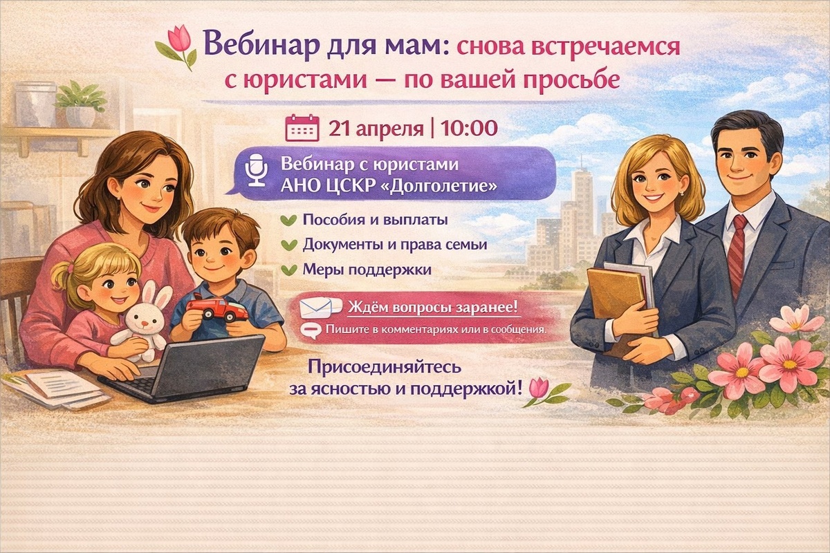 Недавно мы уже проводили такую встречу, и получили много откликов. Стало понятно: тема важная, нужная и очень живая. Поэтому решили повторить вебинар — чтобы ещё больше семей смогли получить ответы на свои вопросы 😊 📅 21 апреля ⏰ 10:00 🎙 Вебинар с юристами АНО ЦСКР «Долголетие» Поговорим о том, что волнует родителей: • пособия и выплаты • документы • права семьи • меры поддержки • и другие ваши вопросы 💬 Ждём вопросы заранее! Можно написать в комментариях или отправить сообщением. 💦Тут интересное про мам и младенцев 💦 ГИД для МАМ по ГВ 🤱 АНО "Мама" 📱 Канал в Вконтакте 🔵 Канал в Мах