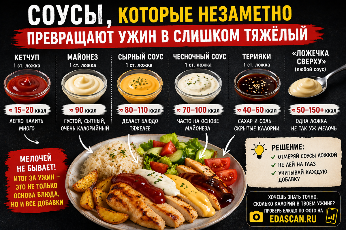 По отдельности всё звучит безобидно. Но ужин складывается не из отдельных оправданий, а из суммарного результата. И если к обычной еде добавить сразу несколько соусов или одну щедрую порцию жирного соуса, блюдо перестаёт быть тем «скромным ужином», который человек потом вспоминает вечером.