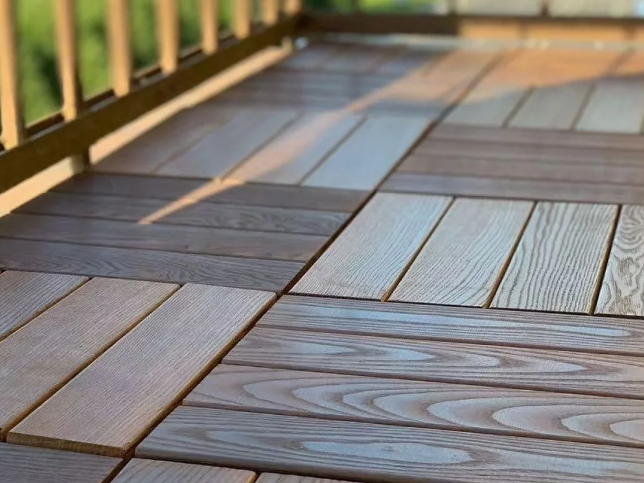 По цвету обычно зелёный, коричневый или серый. Выглядит, конечно, не как натуральное дерево, но для дачи, зоны барбекю или бани — отличный вариант: дёшево, быстро, пластику плевать на влагу.