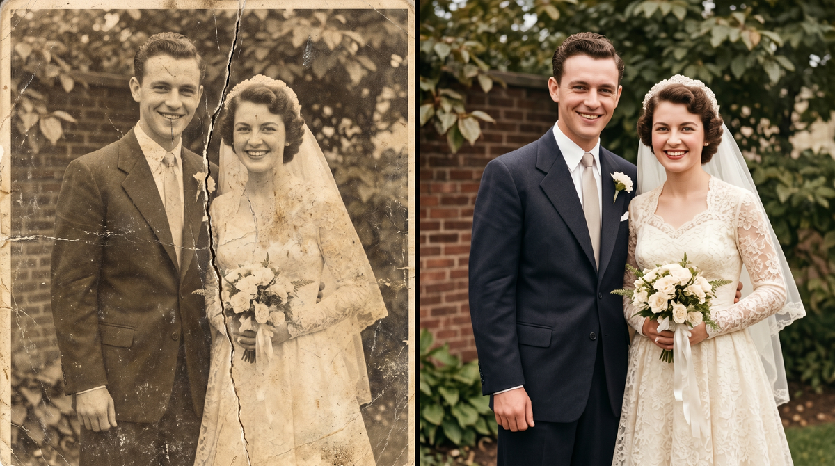 Бабушка хранила свадебные фото в коричневом конверте с выцветшей надписью «София и Петр, 1954». Я аккуратно достала снимок: бумажная основа потрескалась по центру, создавая уродливую линию через платье. Лица были видны, но серые, с выгоревшими деталями. Я сразу представила, как красиво будет смотреться такая фотография в рамке на стене, над письменным столом, где всегда пахнет её духами и старыми книгами.