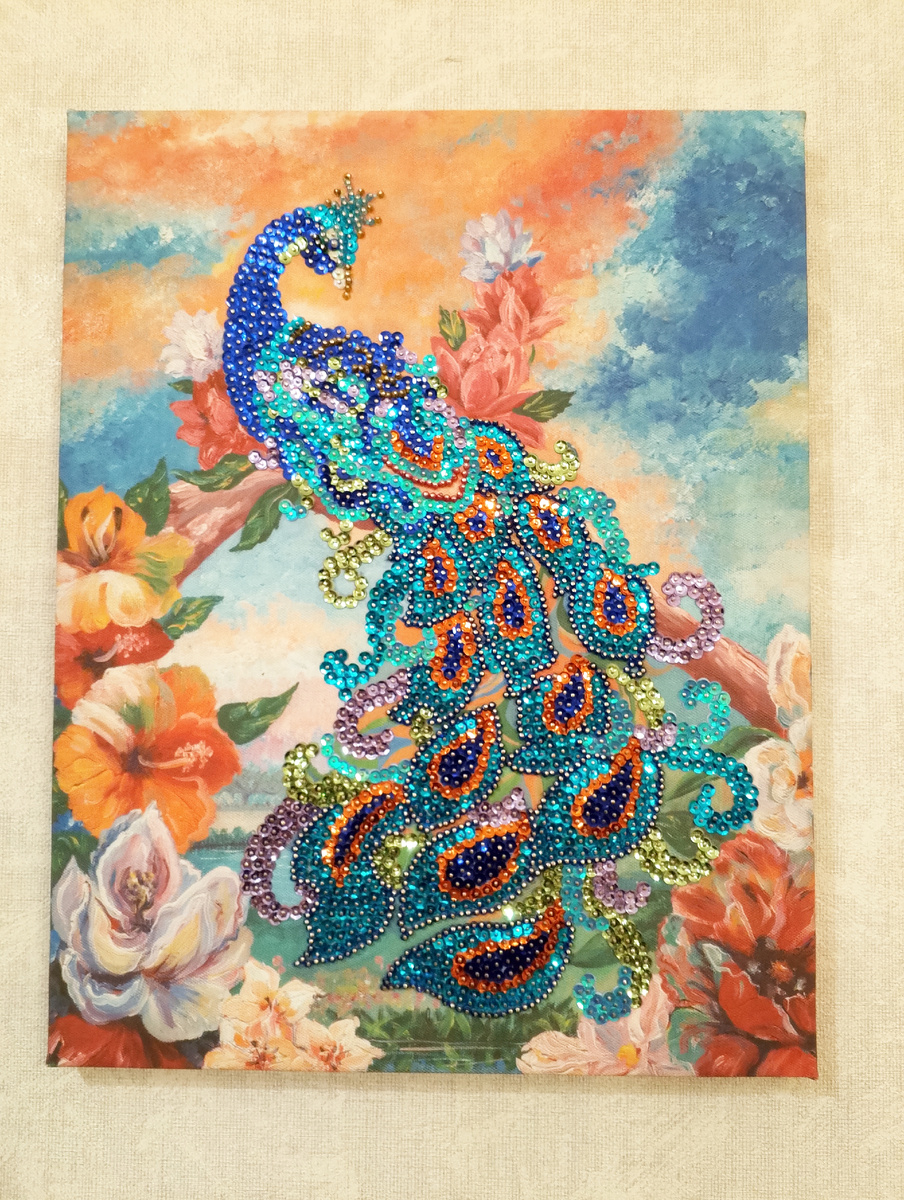 Картина изготовляется очень просто: пайетки и бисер прикалываются гвоздиками к изображению на пенопластовой основе. Несмотря на то, что гвоздики вкалываются легко, пальцы могут уставать.